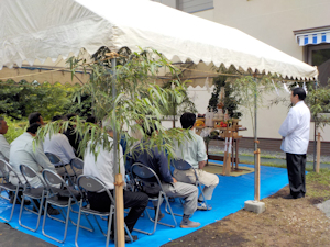 平成28年6月、横浜市環境創造局発注の工事「俣野別邸庭園整備工事」を着工いたしました。 今回の工事は、昨年のグランモール再整備工事に引き続き、サカタのタネ・田口園芸JVにて共同施工を行います。 その安全を祈願し、神主さんをお呼びして俣野別邸内苑区にて安全祈願祭を執り行いました。 当日は梅雨の最中晴天にも恵まれ、厳粛な式の中、竣工まで無事故・無災害で工事に取り組む決意を新たにしました。
