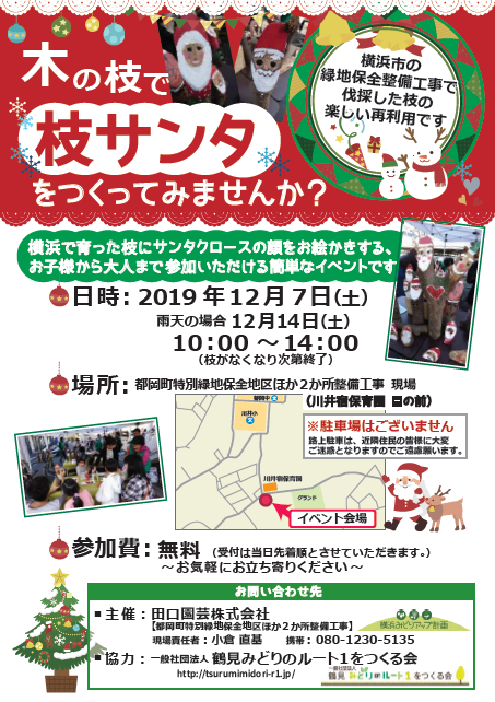 施工中の横浜市・公共工事「都岡町特別緑地保全地区ほか2か所整備工事」の地域貢献の一環として、枝サンタの作成イベントを実施しました。