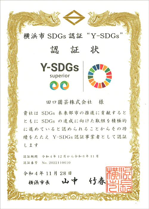 2022年11月、当社の取り組みが評価され、横浜市SDGs認証制度“Y-SDGs”の【上位】Superiorに認証されました。