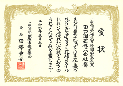 山下公園会場では61回目の開催となる「花壇コンクール」が開催され、横浜の造園技術が光る趣向を凝らした21区画の花壇が出展。その中で、当社の出展花壇に「一般社団法人 横浜市造園協会会長賞」をいただきました。