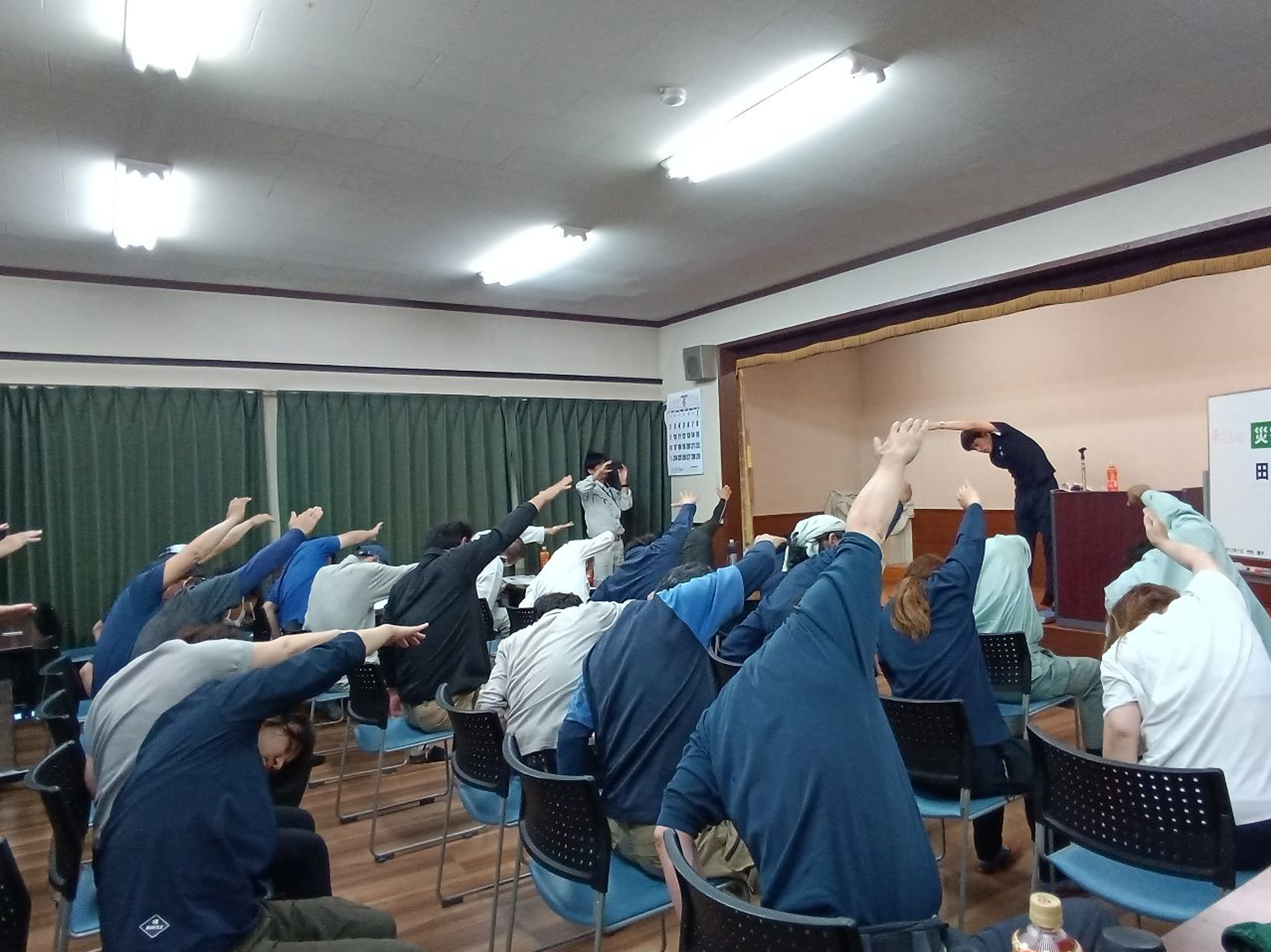 『健康づくり講習』では講師をお招きし、健康管理に関する知識を学びました。労働災害で最も多いとされる腰痛を予防するためのエクササイズについては、レクチャーしていただきながら実際に体を動かしました。