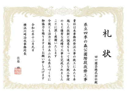 この度、令和6年度に弊社が施工した「県立四季の森公園階段改修工事」につきまして、発注もとである神奈川県横浜川崎治水事務所 所長様より礼状を賜りました。適正な施工管理が認められた業者・技術者に送られるものとのことです。今後も安全と品質を追求し、社会基盤の整備に貢献してまいります。